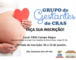 O CRAS de Campo Alegre iniciou as inscrições para mais um Grupo de Gestantes. As inscrições iniciaram nesta segunda-feira 02 de Janeiro, e se estenderão até o dia 13 deste mês.
