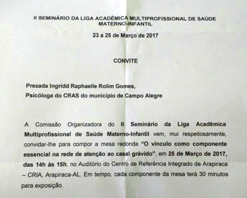 Na oportunidade Ingridd Gomes fará parte da Mesa: "O vínculo como componente essencial na rede de atenção ao casal grávido". O evento ocorrerá no Auditório do Centro de Referência Integrado de Arapiraca (CRIA), no dia 25 de março do corrente ano.