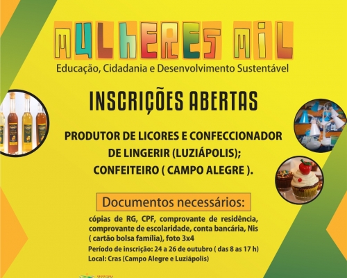 As inscrições podem estão abertas no período de 24 a 26 de outubro no horário das 08 às 17 horas, no Cras de Campo Alegre e do distrito Luziápolis.