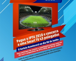 A Secretaria Municipal de Finanças de Campo Alegre lançou nesta quarta-feira 02 de maio a Campanha IPTU 2018 Premiado, onde estará realizando o sorteio de uma Smart TV de 43 polegadas no próximo dia 08 de Junho, dia da emancipação política de Campo Alegre.