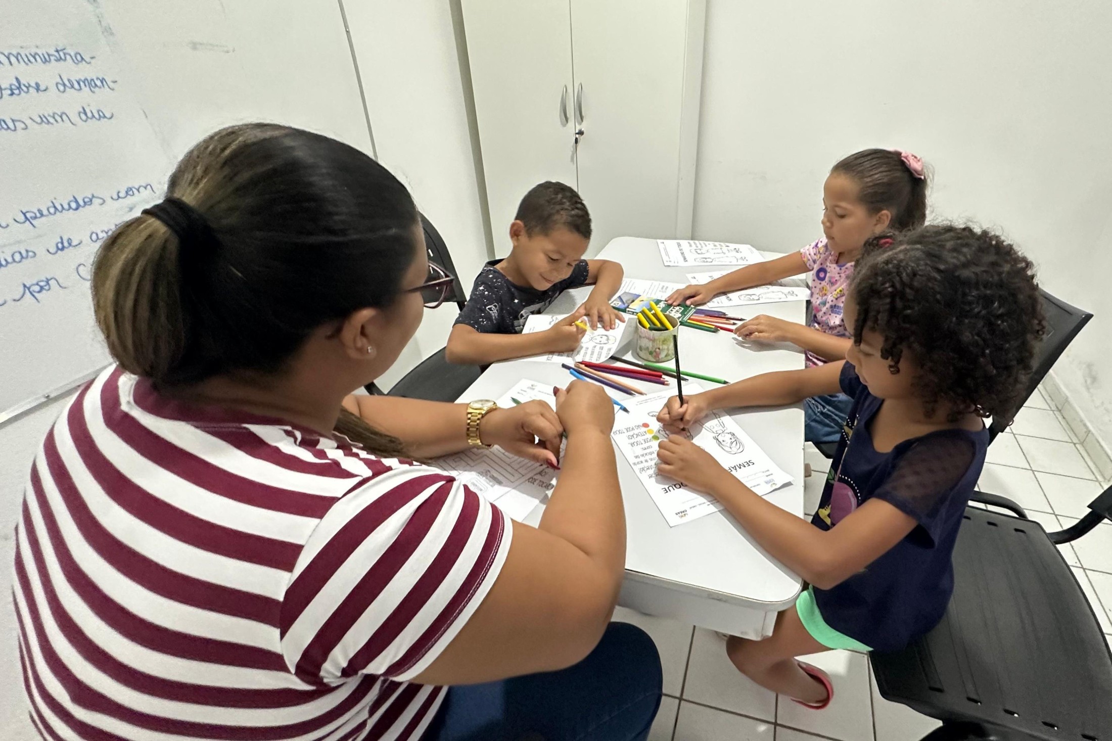 As participantes realizaram atividade de fixação dos conteúdos apresentados e interação entre as famílias acompanhadas, colocando em cartazes figuras que demonstram violações de direitos e promoção de direitos.