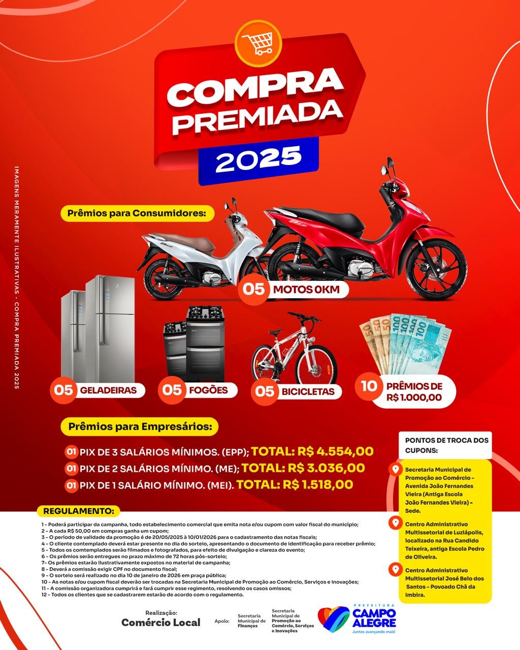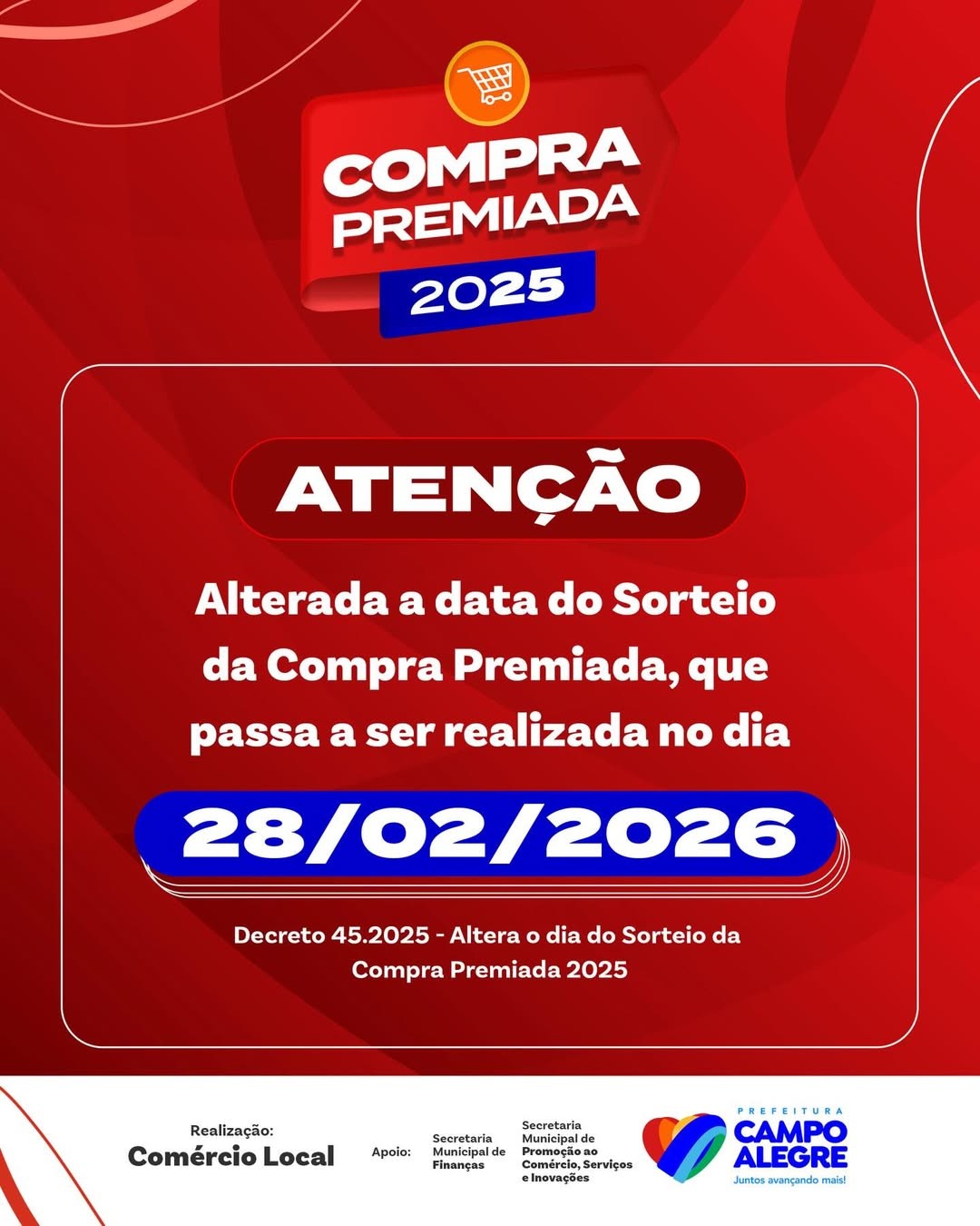 A Prefeitura de Campo Alegre através da Secretaria Municipal de Promoção ao Comércio, Serviços e Inovações de Campo Alegre, anunciou a prorrogação da Campanha Compra Premiada edição 2025. O sorteio que inicialmente estava previsto para o final de dezembro foi prorrogado para o dia 28 de fevereiro.