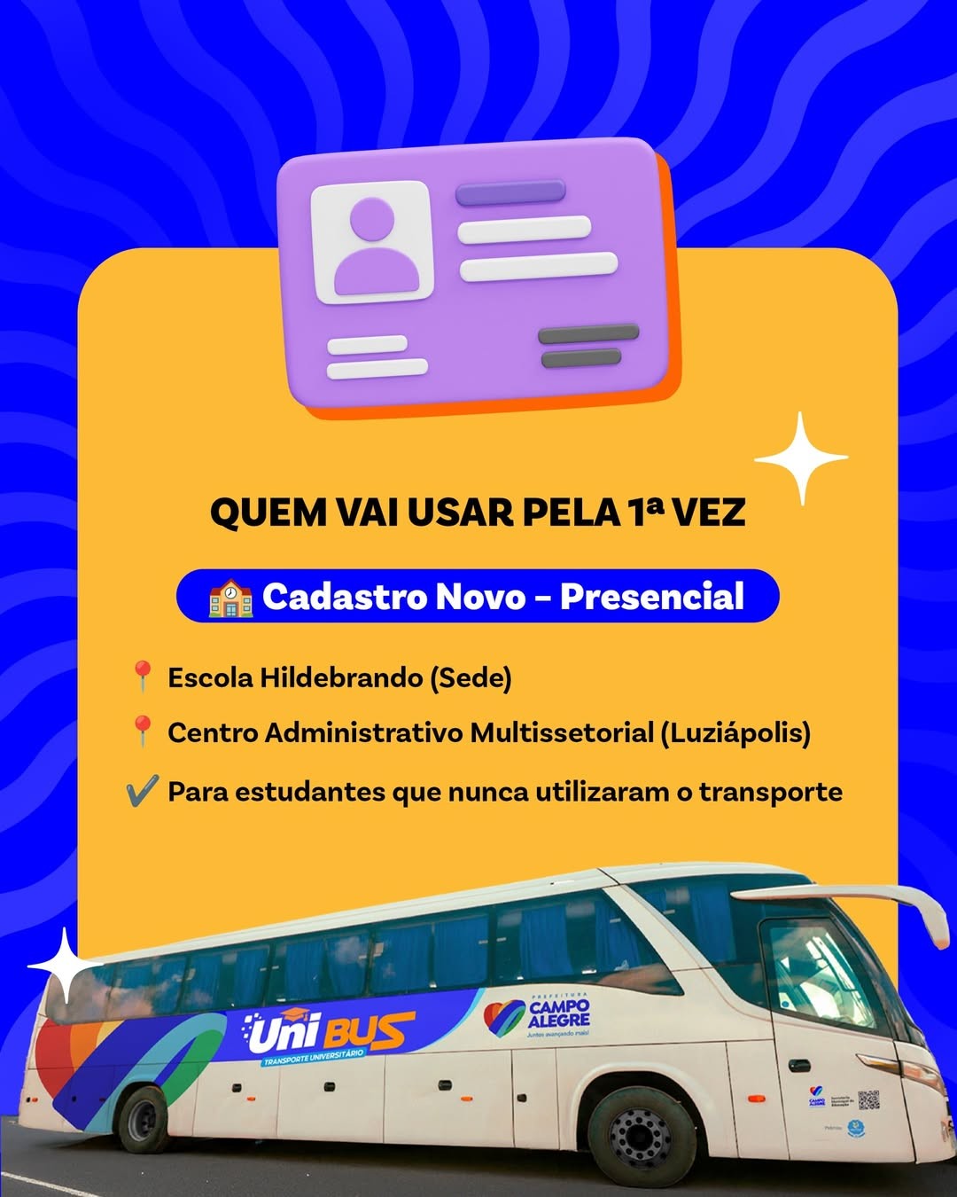 Para os novatos o cadastro acontecerá em Campo Alegre Na Escola Monsenhor Hildebrando Verissimo Guimarães e em Luziápolis no Centro Administrativo Multissetorial localizado na Rua Cândido Teixeira no antigo prédio da Escola Pedro de Oliveira.