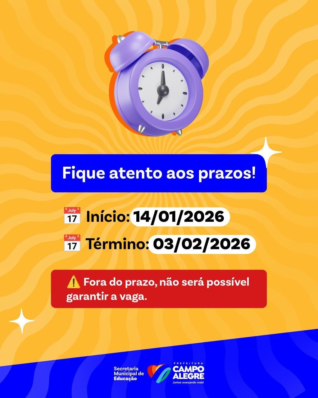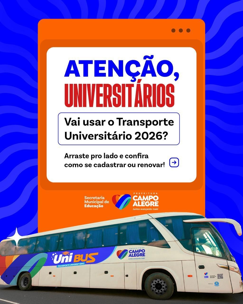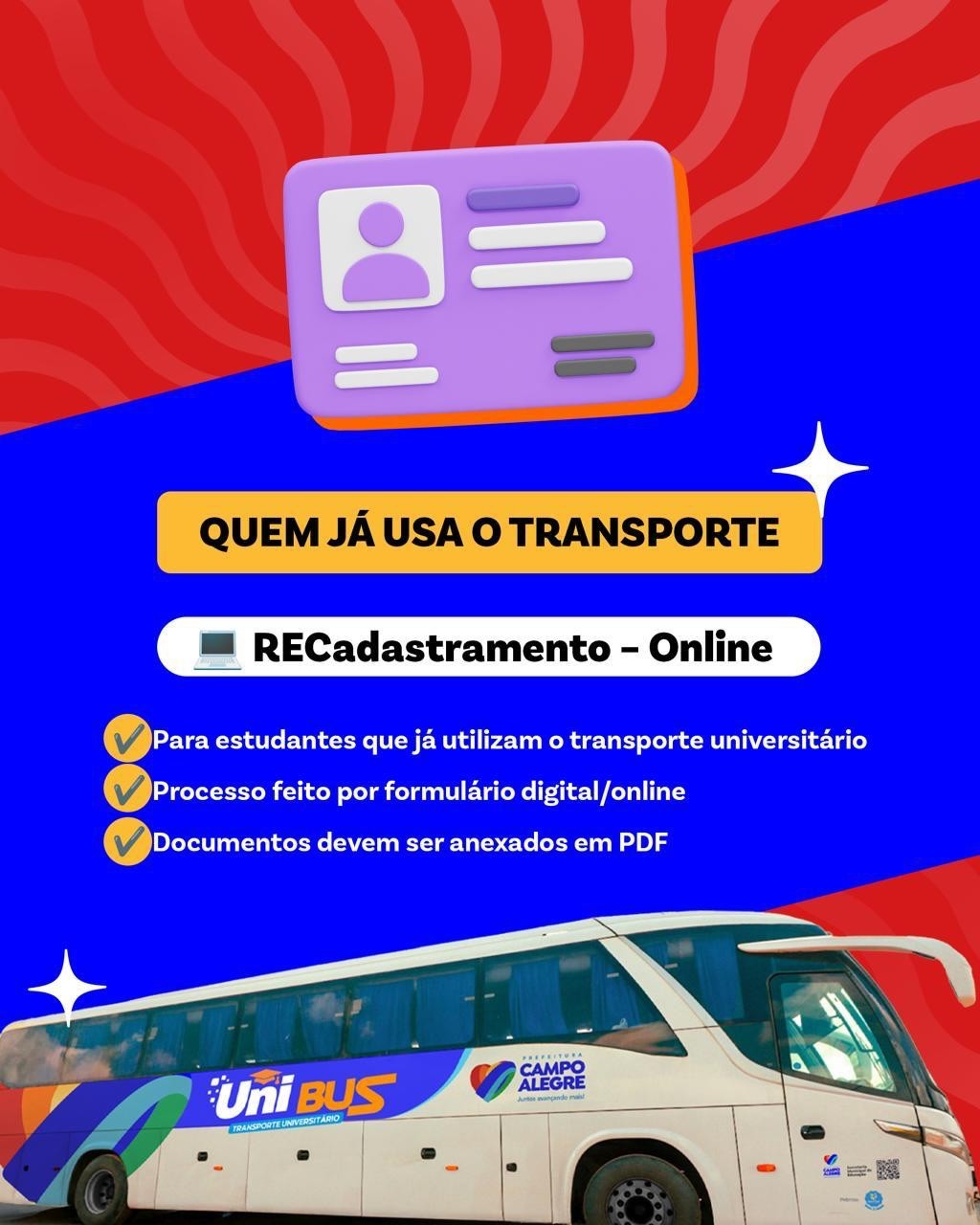 A Secretaria Municipal de Educação de Campo Alegre comunica a todos os estudantes universitários, usuários do transporte público municipal, que no período de 14 de janeiro a 03 de fevereiro estará realizando a atualização dos cadastros de todos os alunos. A realização da atualização é necessária para organização das rotas de transportes que diariamente levam os estudantes para cursarem diferentes faculdades.