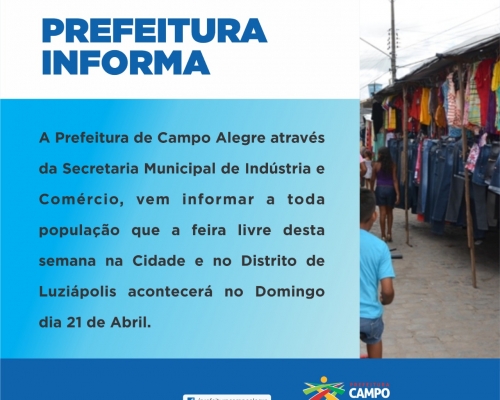 A Prefeitura de Campo Alegre através da Secretaria Municipal de Indústria e Comércio do município está informando a todos os comerciantes, comerciários e feirantes do município e da região que a feira-livre da semana santa tanto na sede do município como no distrito Luziápolis acontecerá no próximo domingo, 21 de Abril, por conta da Sexta-feira da Paixão.