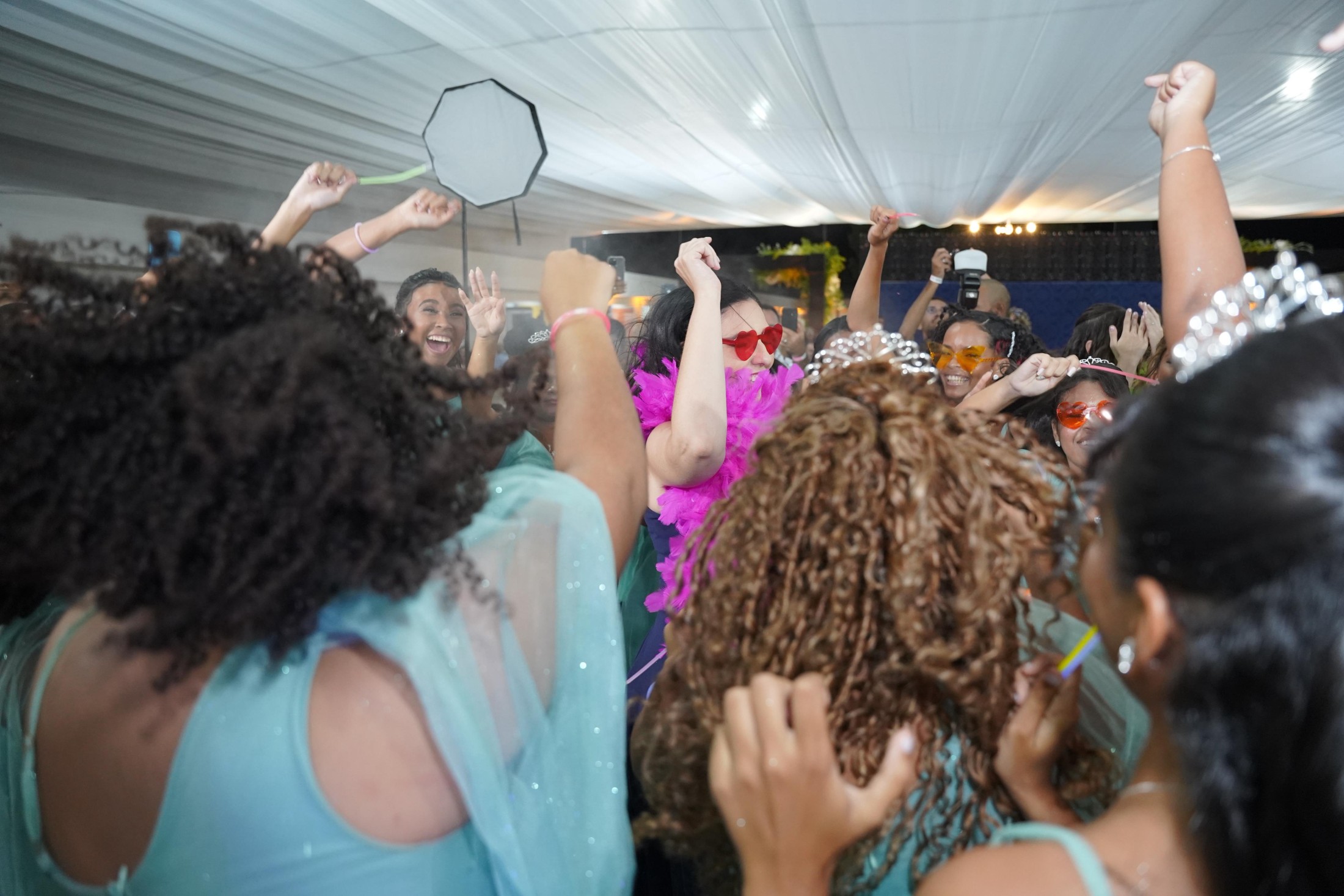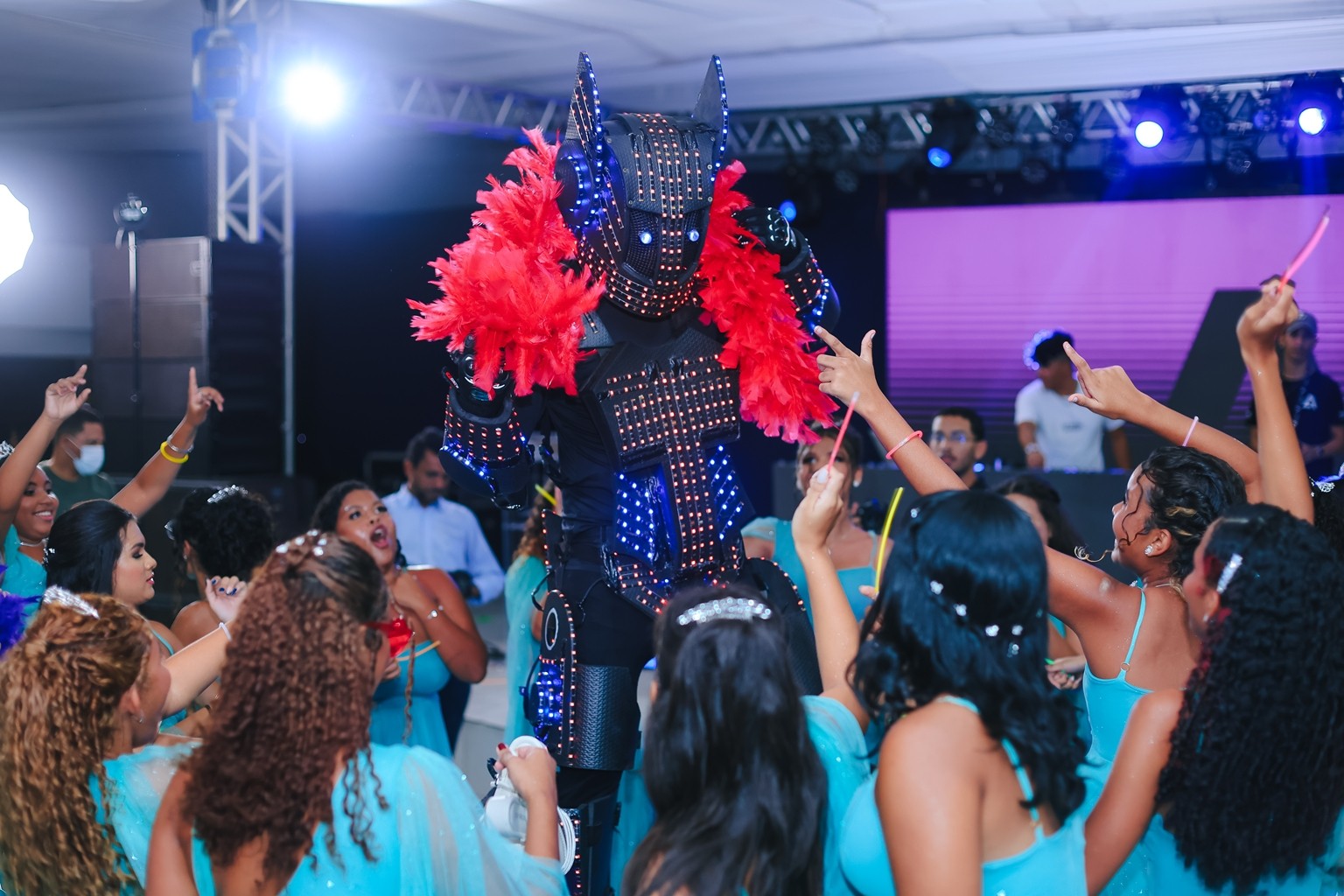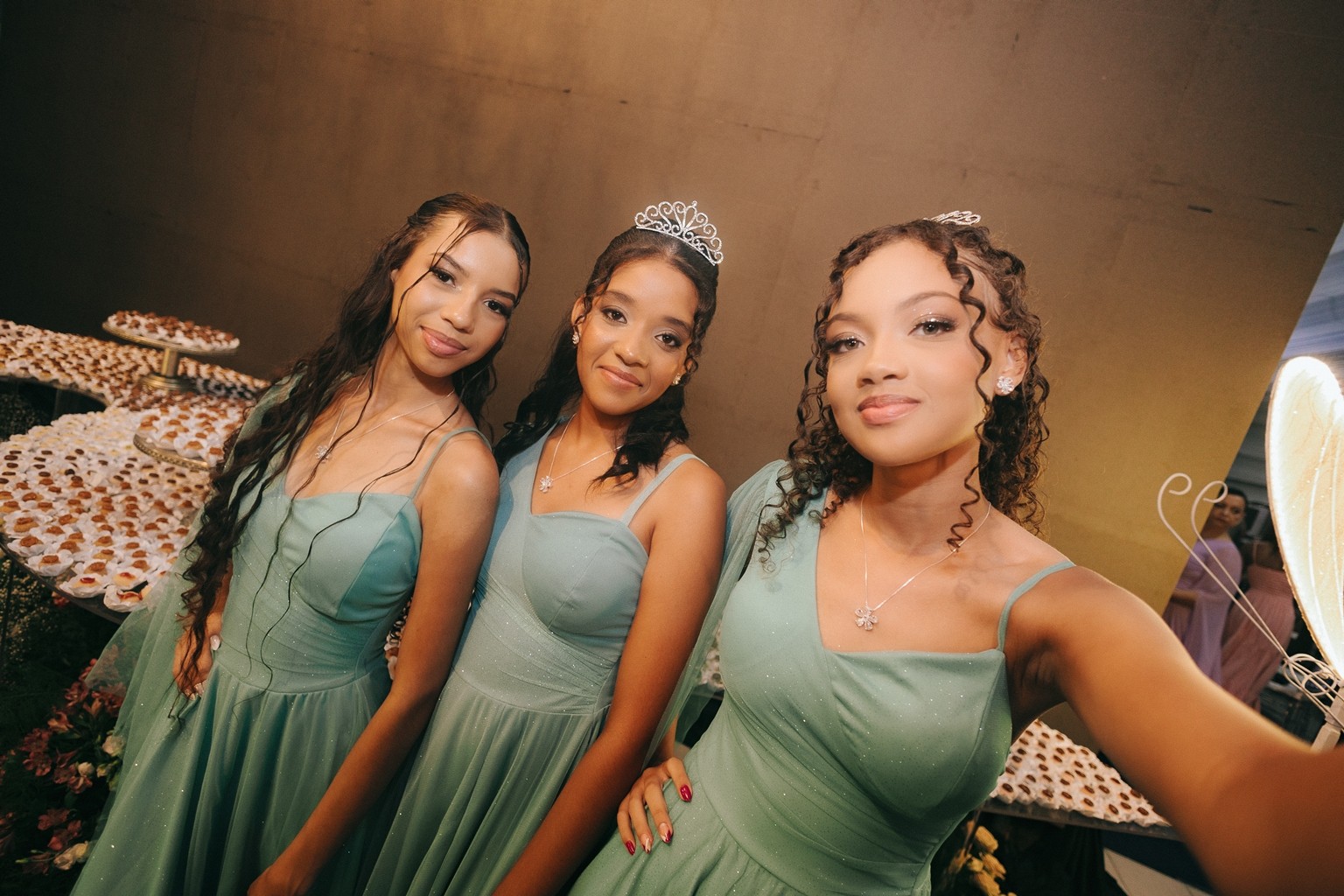 O Baile de Debutante chamou a atenção ainda por elementos dignos de uma grande festa. Aos convidados foi oferecido um buffet completo, com entradas, petiscos, jantar, bolos e doces. Espaço montada uma área para que as meninas e seus convidados se divertirem na hora de registrar o momento com câmeras para vídeos 360º.