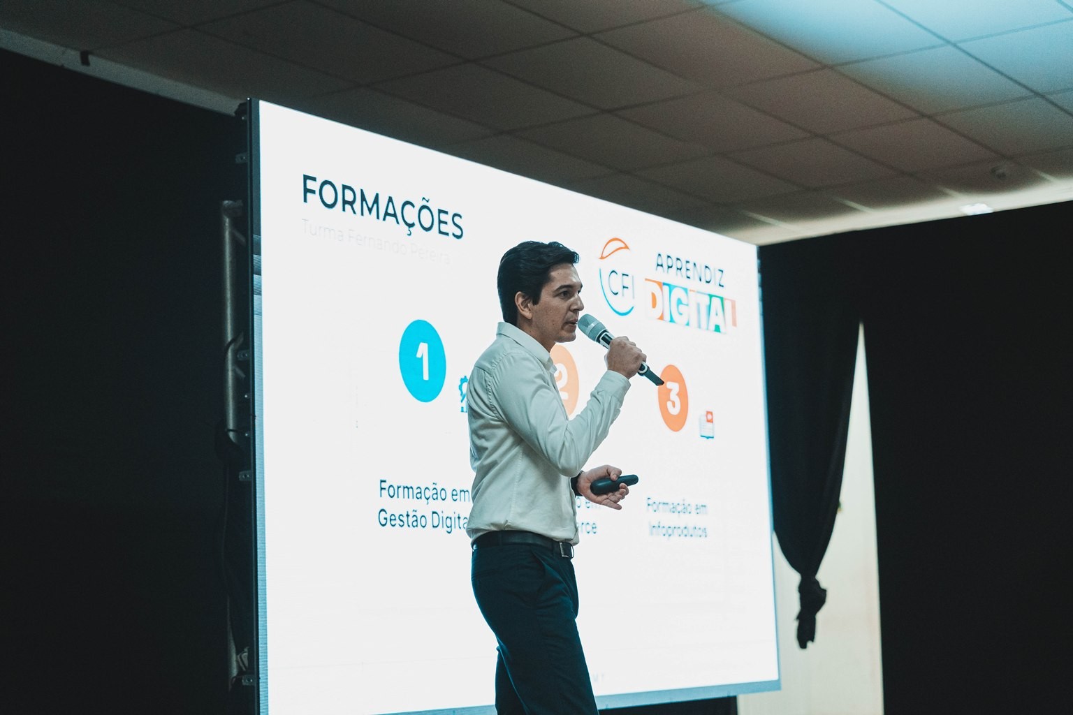 A aula inaugural do programa Aprendiz Digital, idealizado pelo deputado estadual Fernando Pereira, é uma iniciativa realizada por meio da Câmara de Fomento Internacional, voltada para capacitar pessoas para o comércio digital, ensinando: