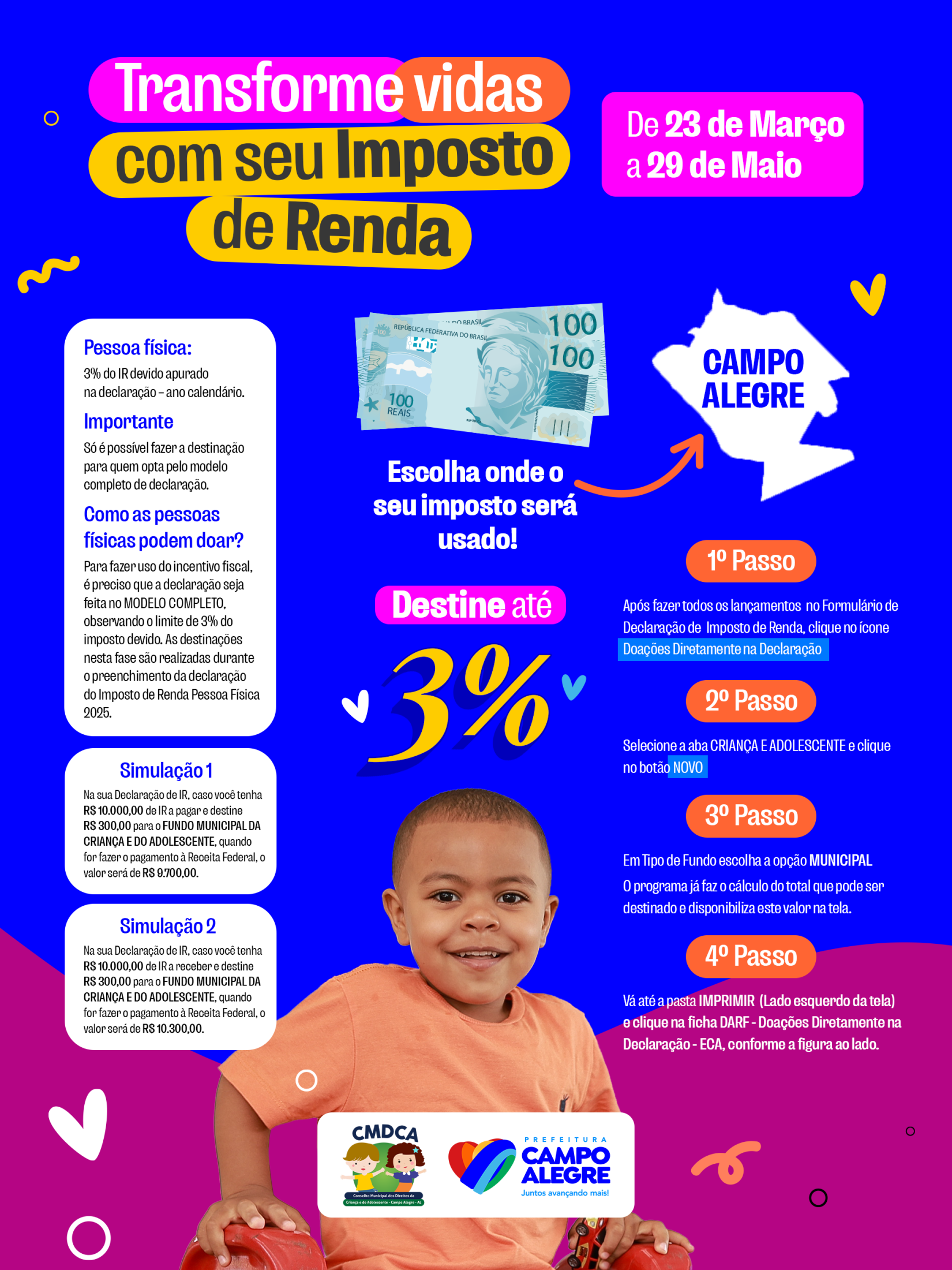 Com o início do prazo para realização da declaração anula do imposto de renda, o Conselho Municipal dos Direitos da Criança e do Adolescente de Campo Alegre - CMDCA lançou mais uma edição da Campanha de Destinação Solidária do Imposto de Renda, que orienta ao contribuinte pessoa física, que faz declaração de imposto de renda, sobre a doação de um percentual do seu imposto para o Fundo da Infância e Adolescência de Campo Alegre.