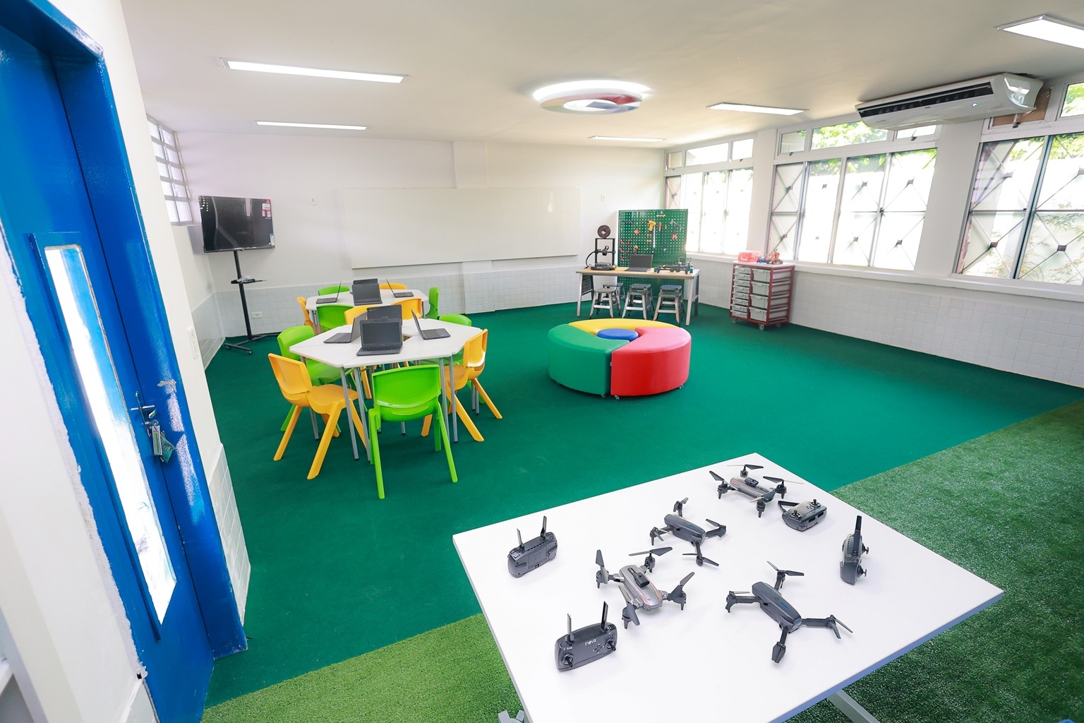 Além disso, os espaços foram pensados para estimular o protagonismo estudantil, incentivando os alunos a explorarem, criarem e resolverem problemas por meio de experiências práticas e colaborativas.