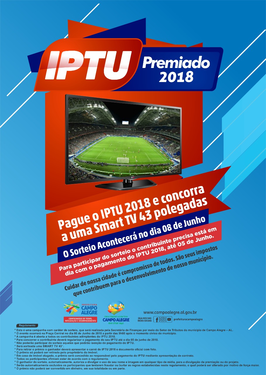 A Secretaria Municipal de Finanças de Campo Alegre lançou nesta quarta-feira 02 de maio a Campanha IPTU 2018 Premiado, onde estará realizando o sorteio de uma Smart TV de 43 polegadas no próximo dia 08 de Junho, dia da emancipação política de Campo Alegre.