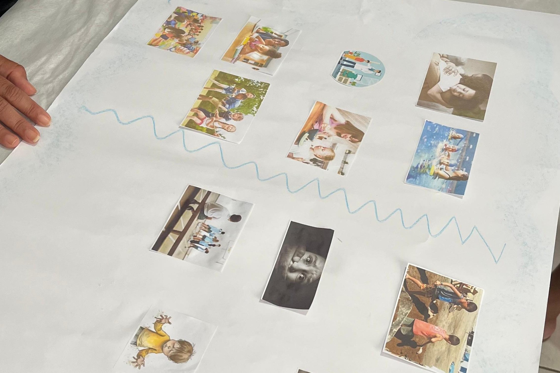 As participantes realizaram atividade de fixação dos conteúdos apresentados e interação entre as famílias acompanhadas, colocando em cartazes figuras que demonstram violações de direitos e promoção de direitos.