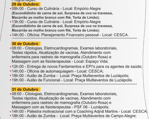 08:00 - Citologias, Eletrocardiogramas, Exames laboratoriais, Testes rápidos, Atualização de vacinas, Atendimento com enfermeira para rastreio de mamografia (Outubro Rosa) e Massagem com as fisioterapeutas - PSF 06 - Luziápolis.