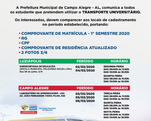 O município de Campo Alegre nos últimos anos vem ampliando a oferta do transporte para estudantes universitários que são o público prioritário e estudantes de cursos profissionalizantes, contribuindo com o processo de desenvolvimento profissional desses munícipes que anseiam por melhores oportunidades no mercado de trabalho.