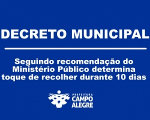 Acompanhando recomendações do Ministério Público, por intermédio da Promotoria de Justiça de Campo Alegre, a Prefeitura de Municipal decretou nesta quarta-feira 24, o Decreto Municipal nº 41/2020, que entre outras medidas trata do funcionamento do toque de recolher durante o período de 10 dias no município de Campo Alegre.