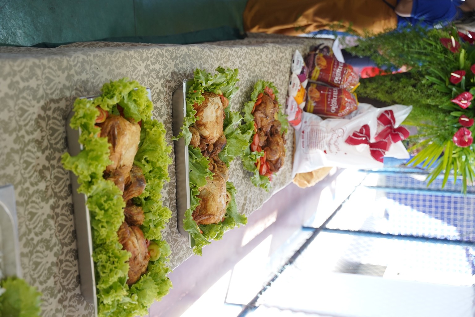 As cestas são compostas de itens como: feijão, arroz, açúcar, café, farinha de mandioca, margarina, peixe em conserva, leite em pó, biscoitos, flocão de milho, óleo de soja, macarrão, além do frango com mais de 04 quilos e já temperado pronto para ser cozido.