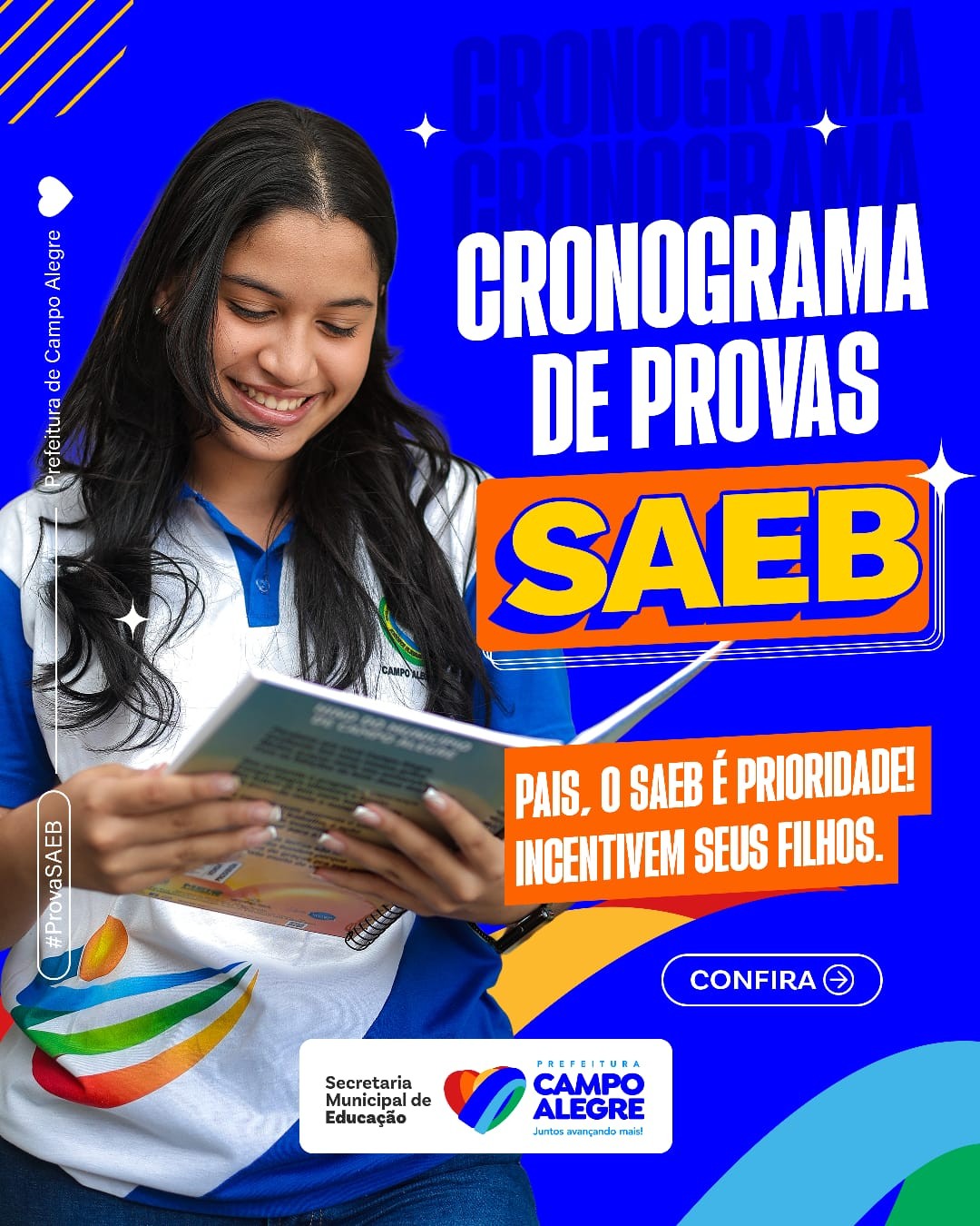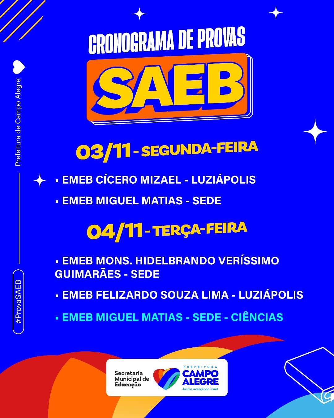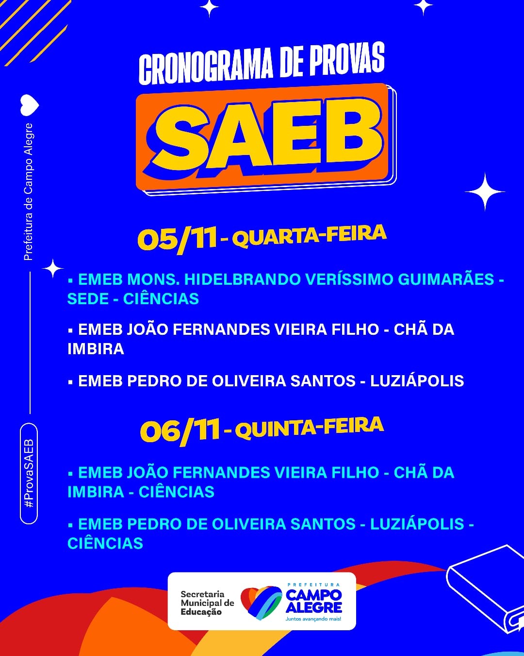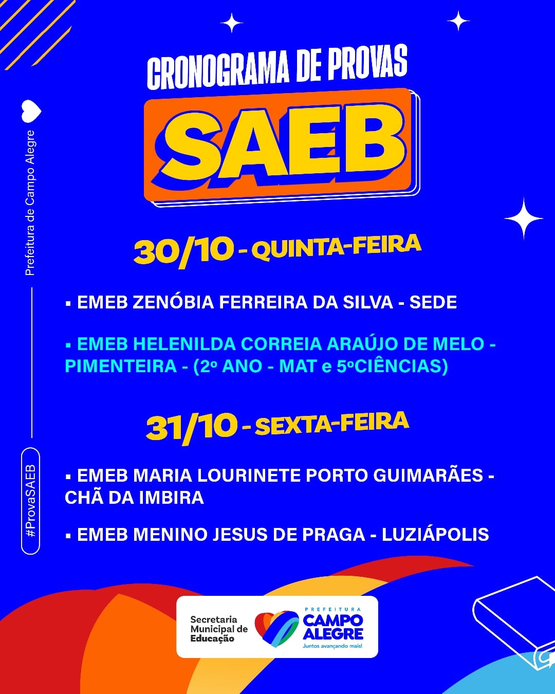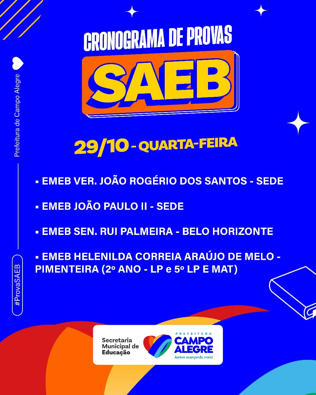 No município de Campo Alegre, as provas acontecerão no período de 29 de outubro a 06 de novembro, para todos os alunos das turmas de 5º e 9º ano, da Rede Pública Municipal de Ensino, seguindo o seguinte cronograma: