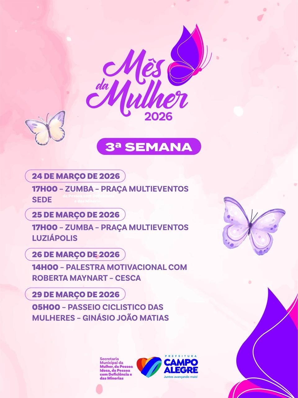 Durante o período de 09 a 29 de Março a Prefeitura de Campo Alegre estará promovendo vários eventos, atividades e oficinas para as mulheres campo-alegrenses em homenagem ao mês da Mulher 2026.