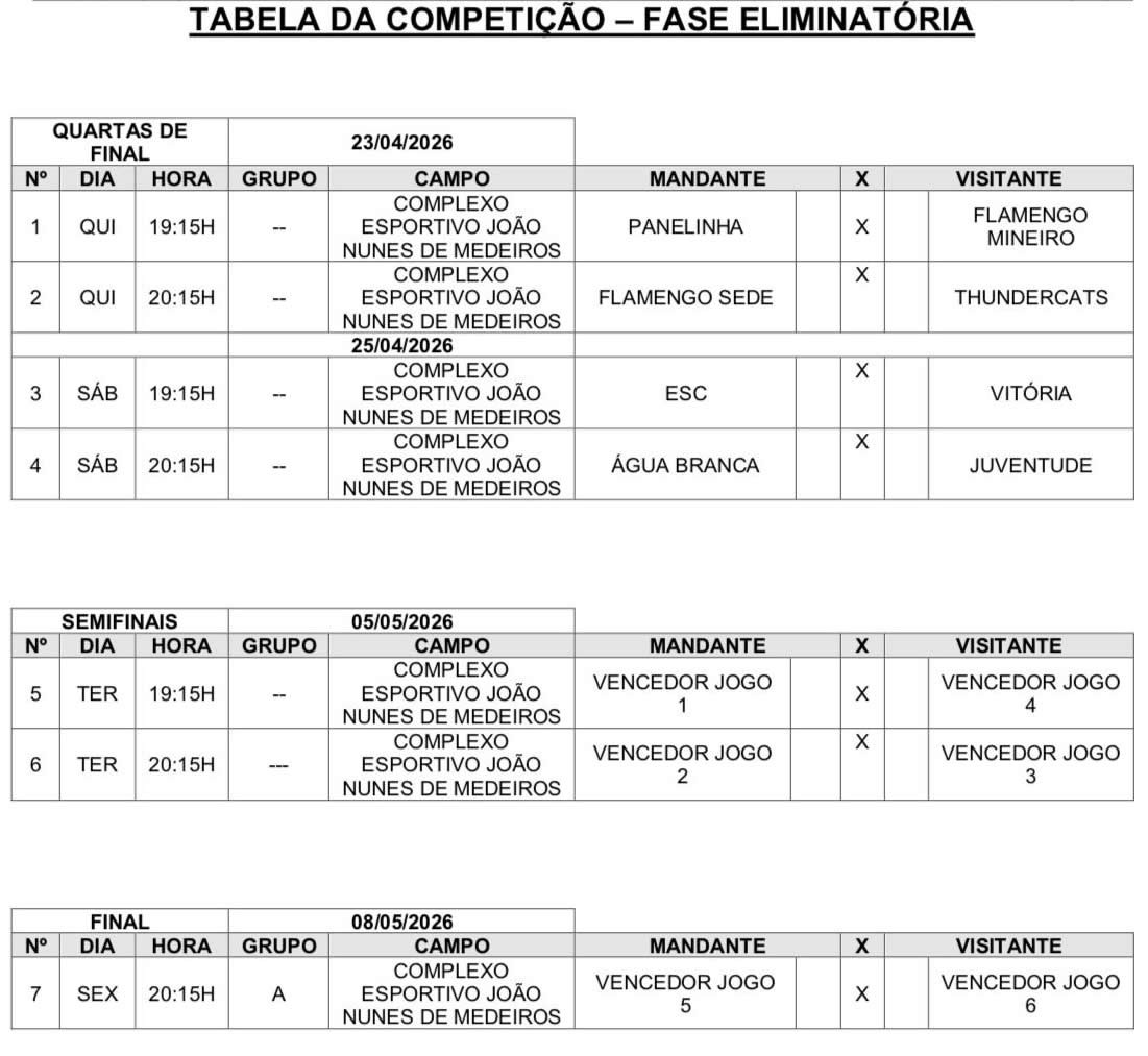 Após todos os jogos da primeira fase classificaram-se as 02 melhores equipes de cada grupo para a fase de quartas de finais que iniciarão na quinta-feira 23 de abril.