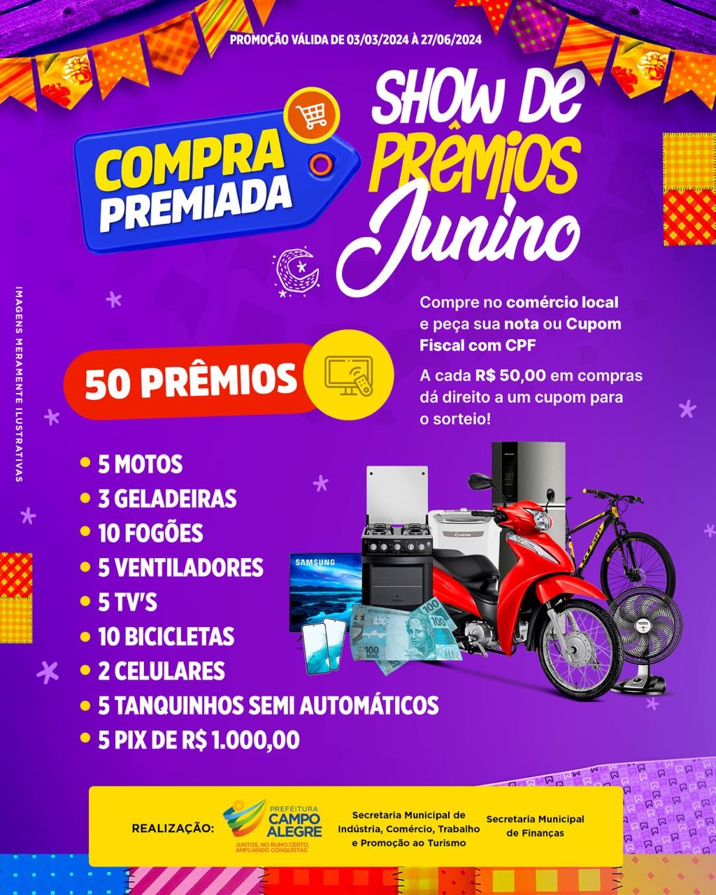A Secretaria Municipal de Indústria e Comércio de Campo Alegre lançou recentemente o Show de Prêmios Junino, que será uma campanha nos moldes da Compra Premiada, que realizará no inicio do mês de Julho o sorteio de 50 prêmios, incluindo 05 motos, geladeiras, fogões, prêmios em PIX, entre outros.