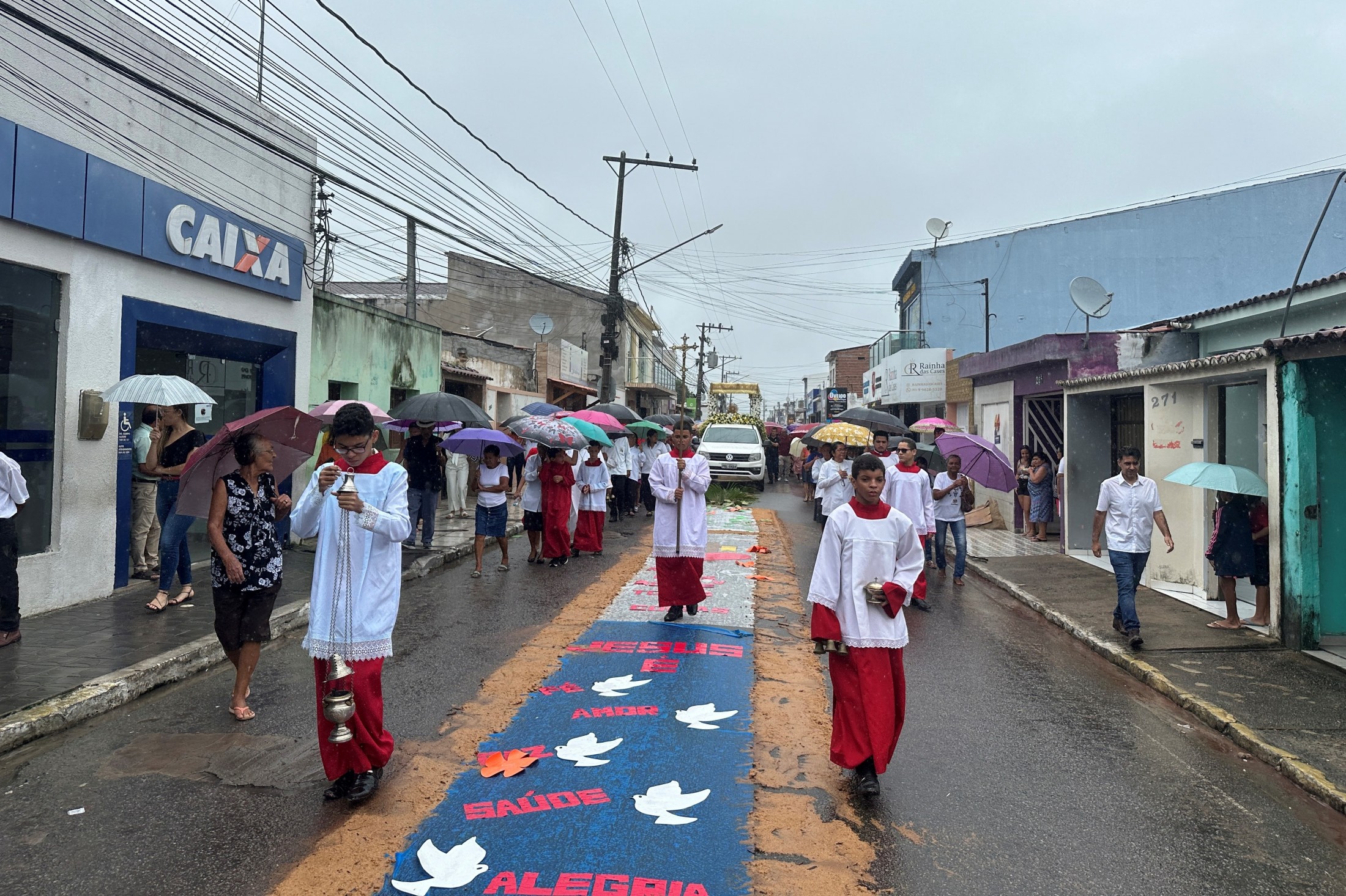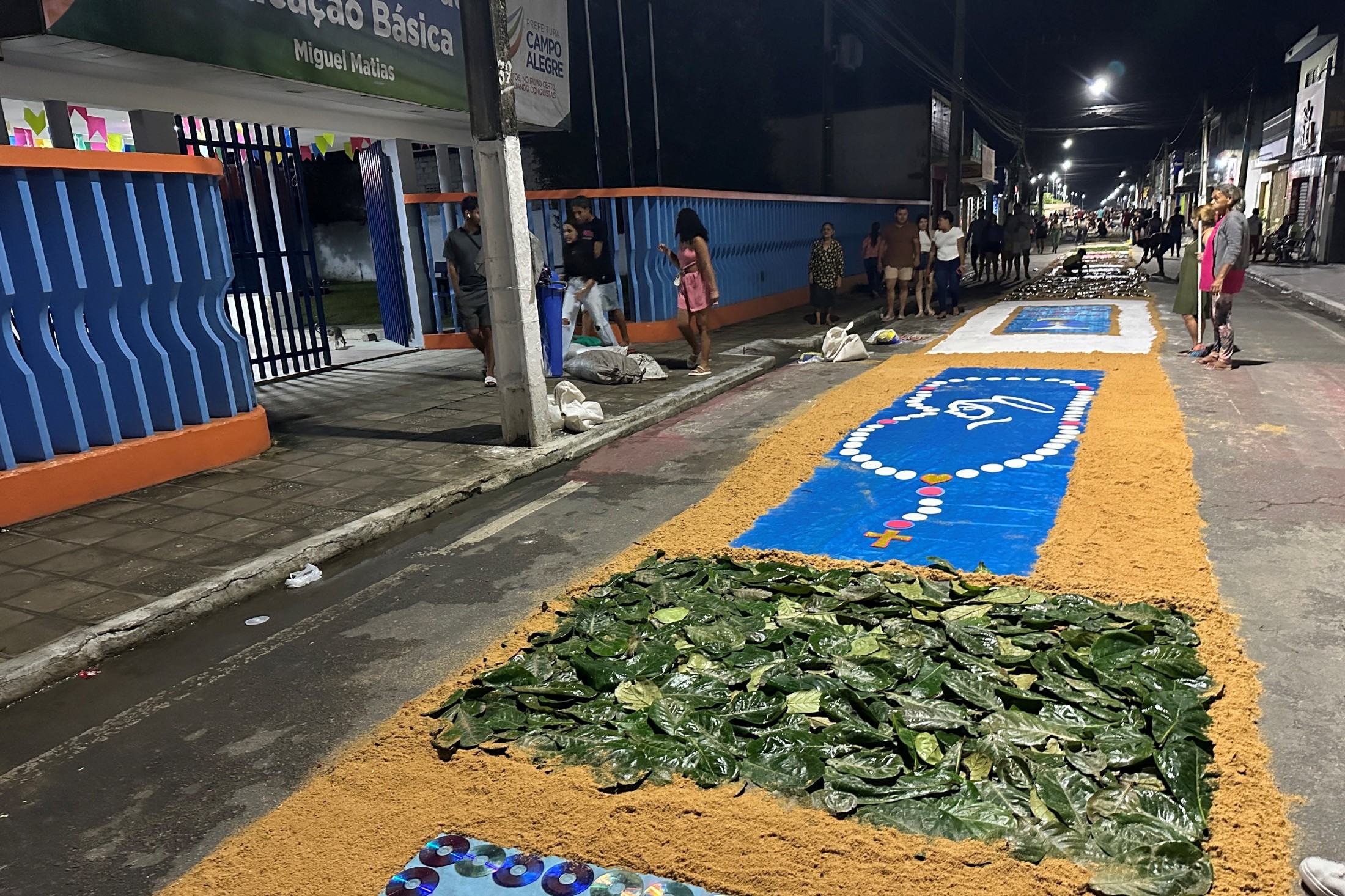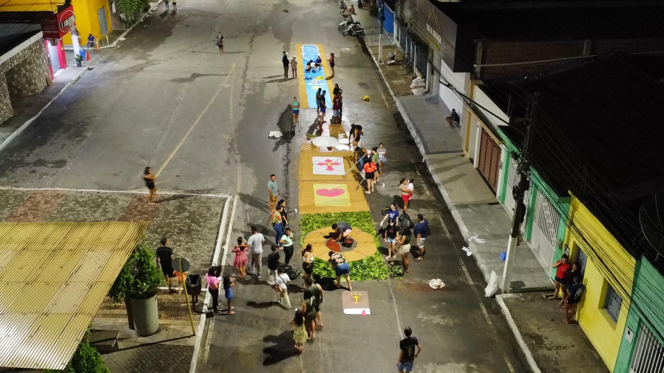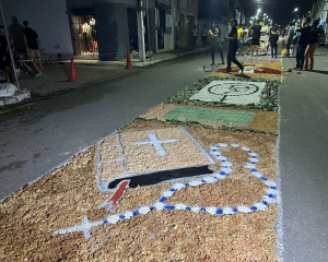 Durante o percurso, belas obras de arte, mensagens religiosas, textos bíblicos e desenhos da fé cristã, tudo com muita criatividade de artistas anônimos que, como misto de fé e tradição, vem mantendo a cada ano o lindo tapete.
