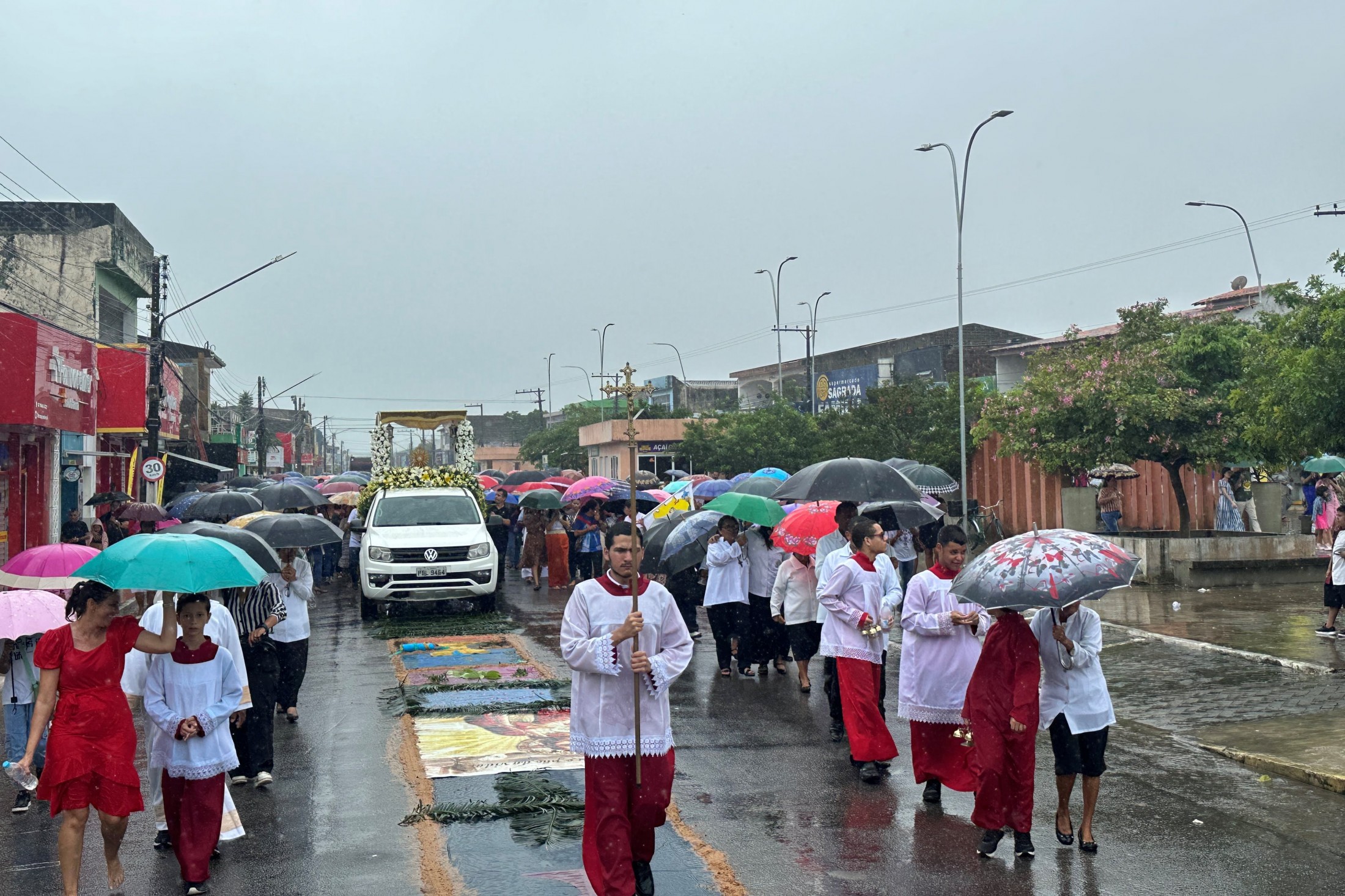 Este ano uma multidão de fiéis participou da celebração da Santa Missa que aconteceu na Igreja Matriz Senhor Bom Jesus dos Aflitos, e seguida da tradicional procissão do tapete. A celebração foi ministrada pelo pároco local Padre Jackson do Nascimento sendo mais momento de muita fé e devoção pelos fiéis presentes.