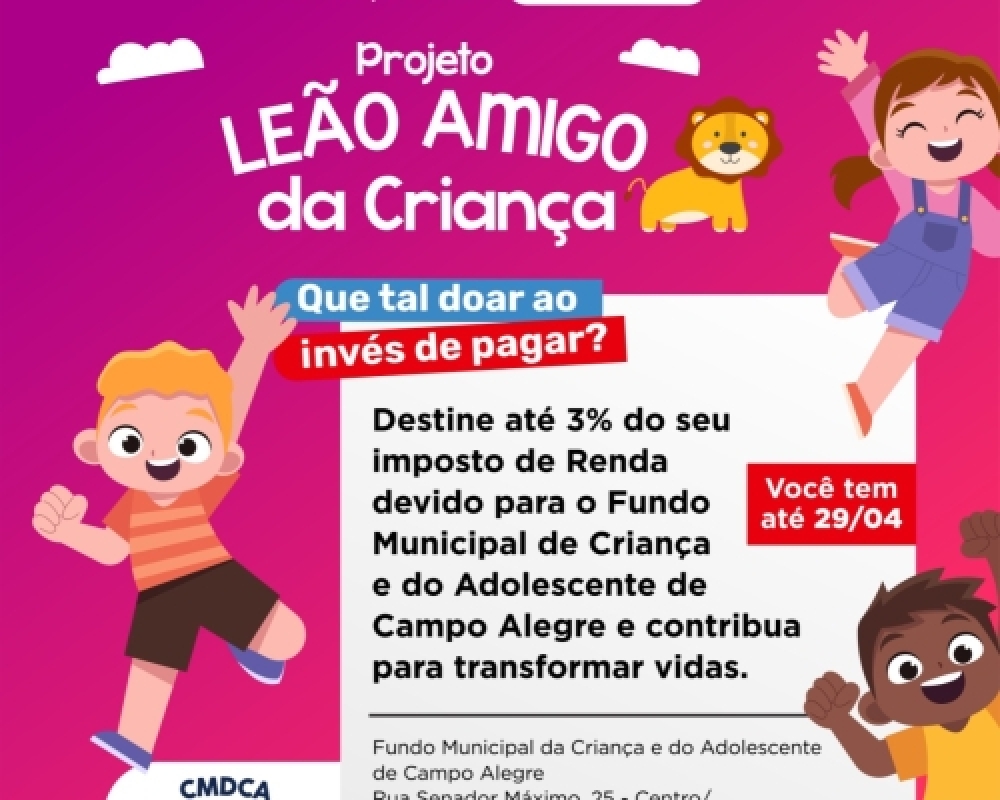 O Conselho Municipal da Criança e do Adolescente de Campo Alegre – CMDCA, lançou mais uma edição da campanha “Leão amigo da Criança”, que orienta ao contribuinte pessoa física, que faz declaração de imposto de renda, sobre a doação de um percentual do seu imposto de Renda para o Fundo da Infância e Adolescência de Campo Alegre.