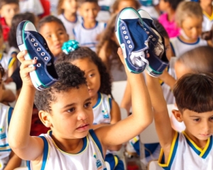 Nesta primeira etapa foram distribuídos para os alunos das 10 Escolas de Educação Básica que ofertam ensino em tempo integral, e em breve será realizada a distribuição para os 05 Centros de Educação Infantil, que receberão papetes e meias com solado, e para mais duas escolas de ensino fundamental que atendem aos alunos de 1º ao 5º ano de forma parcial.