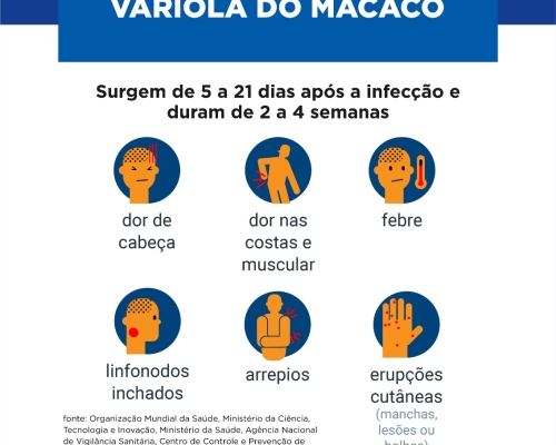 Período de invasão – de 0 a 5 dias: caracterizado por febre, dor de cabeça intensa, inchaço dos gânglios linfáticos, dor nas costas, dores musculares e falta de energia. O aumento das “ínguas” é uma característica que difere o monkeypox de outras doenças que podem inicialmente parecer semelhantes ao vírus, como o sarampo.