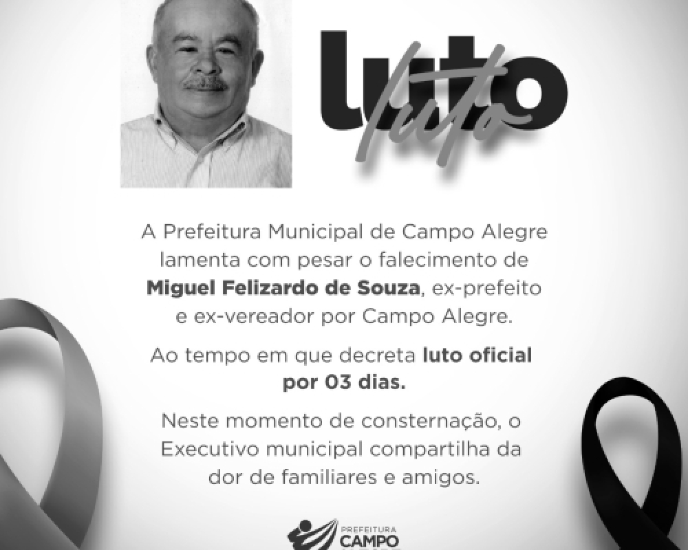 A Prefeitura de Campo Alegre decretou luto oficial por três dias devido o falecimento do ex-prefeito e ex-vereador Miguel Felizardo de Souza, ocorrido nesta quinta-feira 05 de Janeiro de 2023.