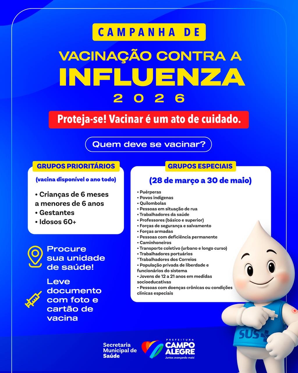 Nesta segunda-feira (30), a Prefeitura de Campo Alegre, por meio da Secretaria Municipal de Saúde, iniciou a estratégia de vacinação contra o vÃrus influenza em 2026. A Camonaha de vacinação teve inicio em todas as Unidades Básicas de Saúde (UBS) que já estão oferecendo o imunizante.